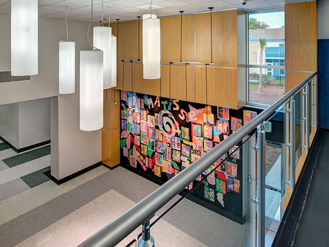 After masterplanning and designing a temporary campus for North Charleston Creative Arts Elementary School in 2011, SMHa, in coordination with Craig Gaulden Davis, ultimately designed this new 80,000-square-foot building. Completed in 2016, NCCAE is an arts-infused partial magnet school offering visual and performing arts curriculum to students in grades K-5. The school has a designated arts wing containing rooms for art, drama, chorus, instrumental music, and a dance studio. A centrally located art gallery is used to exhibit student artwork. In keeping with the arts theme, the interiors are colorful and whimsical to encourage creativity and inspire the students.