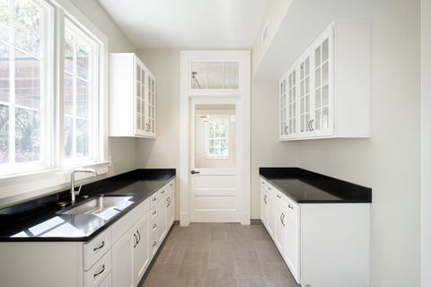 The existing structure had extensive moisture and termite damage along with various environmentally hazardous materials common for the age of the building. Following the Department of Interior Standards for Rehabilitation, original materials including siding, trim, windows, and interior millwork were removed and restored with repair materials milled to match original profiles. Structural work was required to strengthen the roof decking, replace rotted and termite-damaged framing, and shotcrete was added to the brick foundation walls for reinforcement.